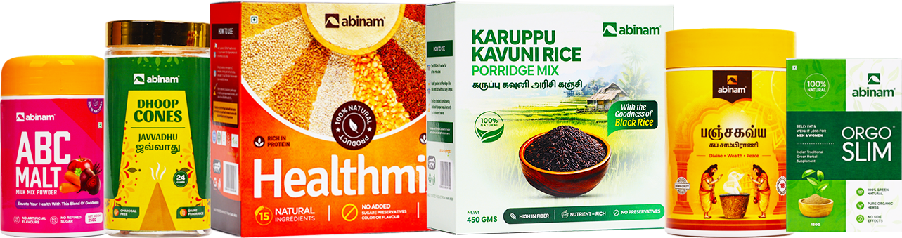 Abinam is a Tamil Nadu-based Indian manufacturer and brand owner specializing in healthy and traditional food products, herbal wellness solutions, and divine pooja products. Our mission is simple: to preserve India's time-tested wisdom while delivering safe, high-quality products through modern manufacturing practices.